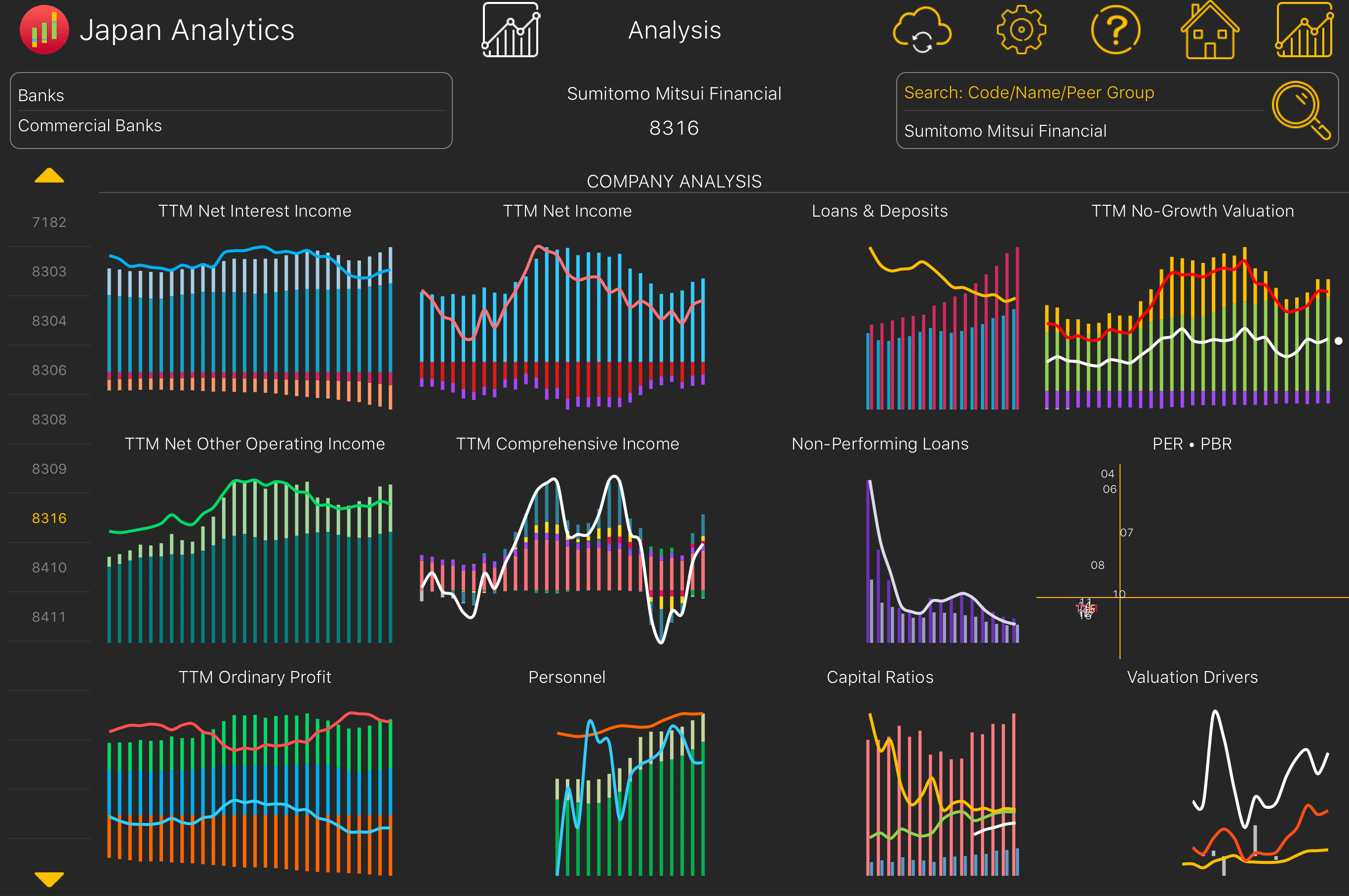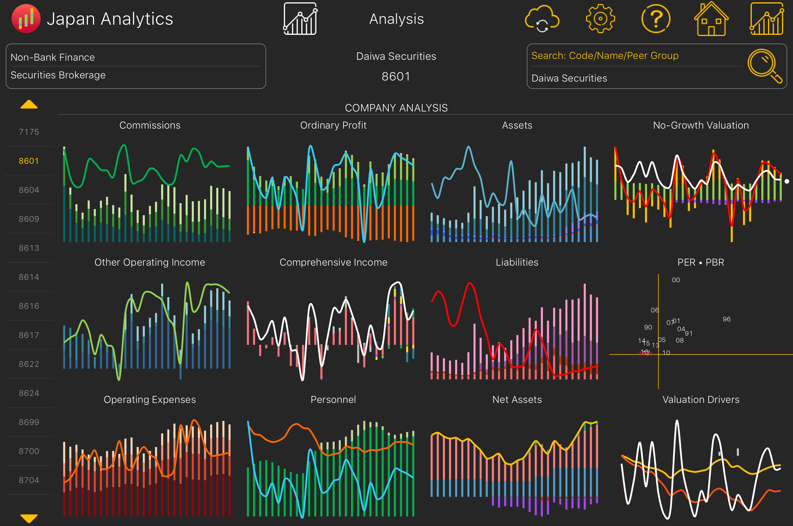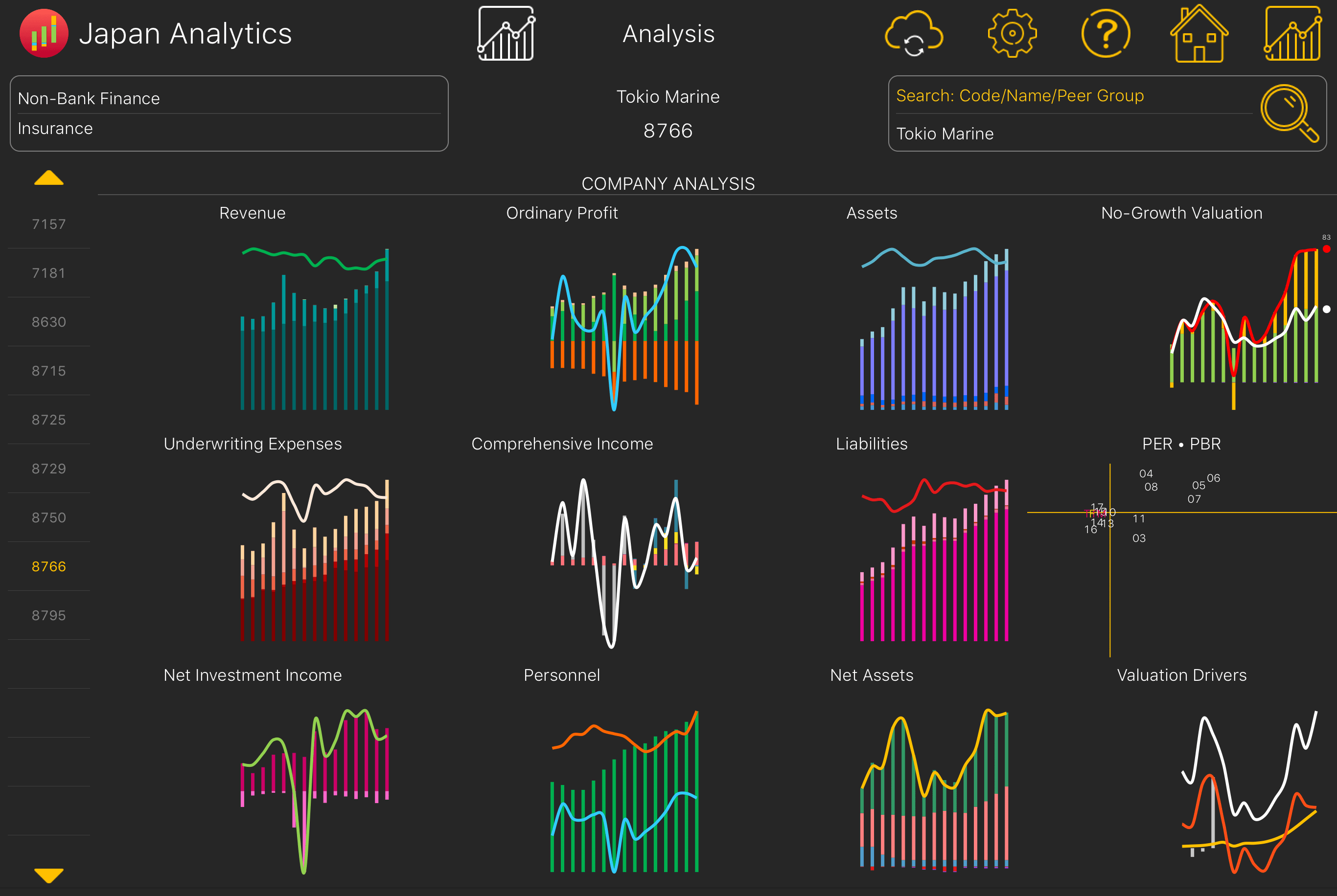 The Japan Analytics Analysis Module is the key analytical module in the App. An innovative approach to financial data visualization provides users with ready access to all key corporate financial and accounting data by means of 144 charts covering 530 data series for non-financial companies and 12 charts covering between 41 to 78 data series for financial companies. Every chart is no more than three taps away from any point in the App.