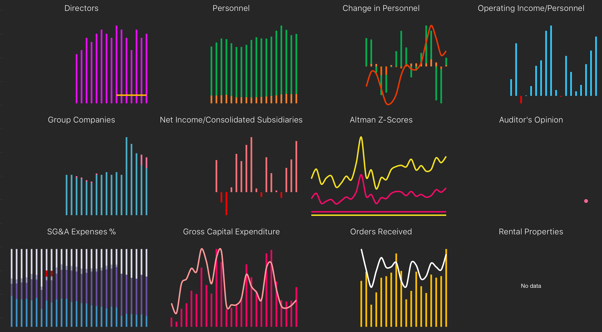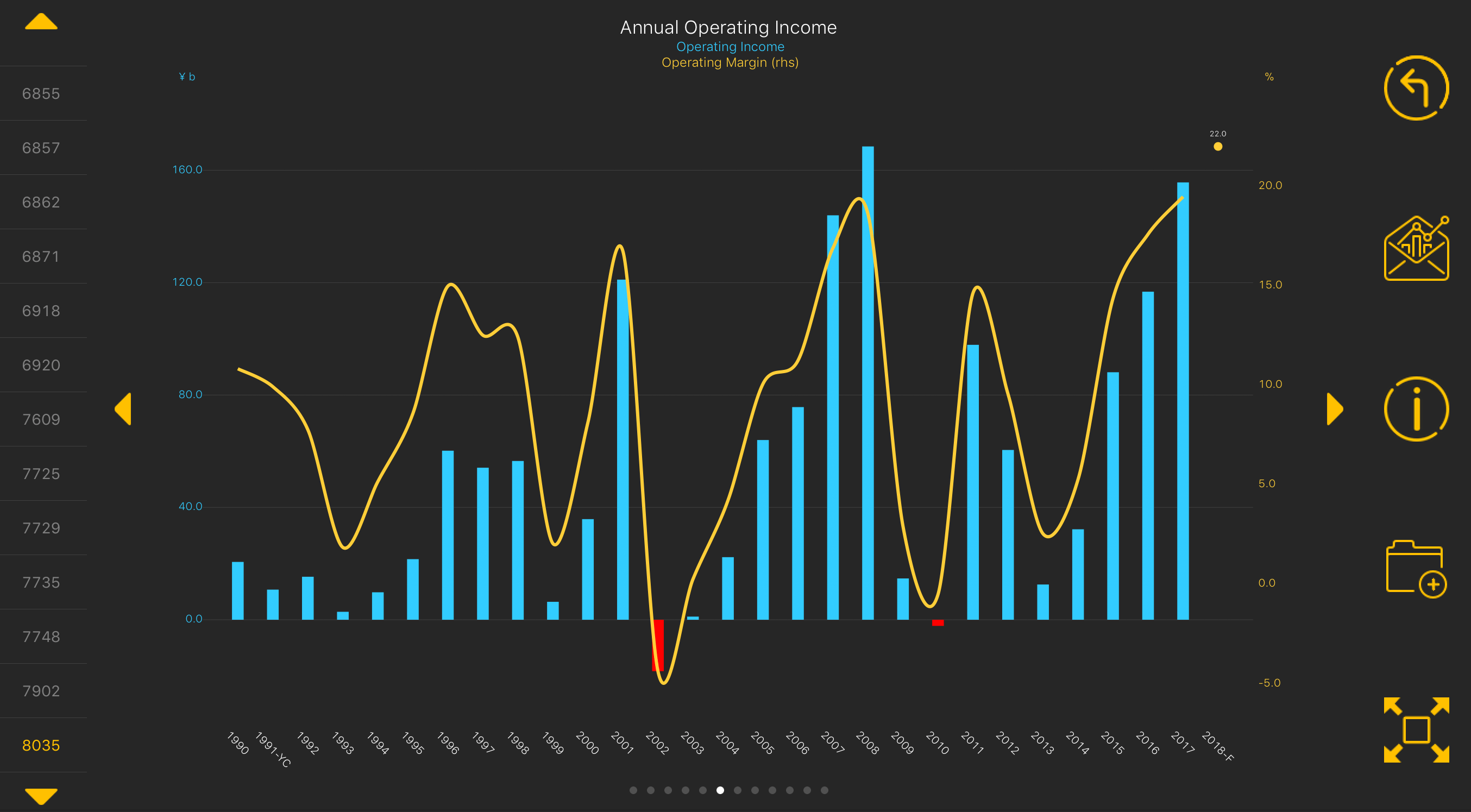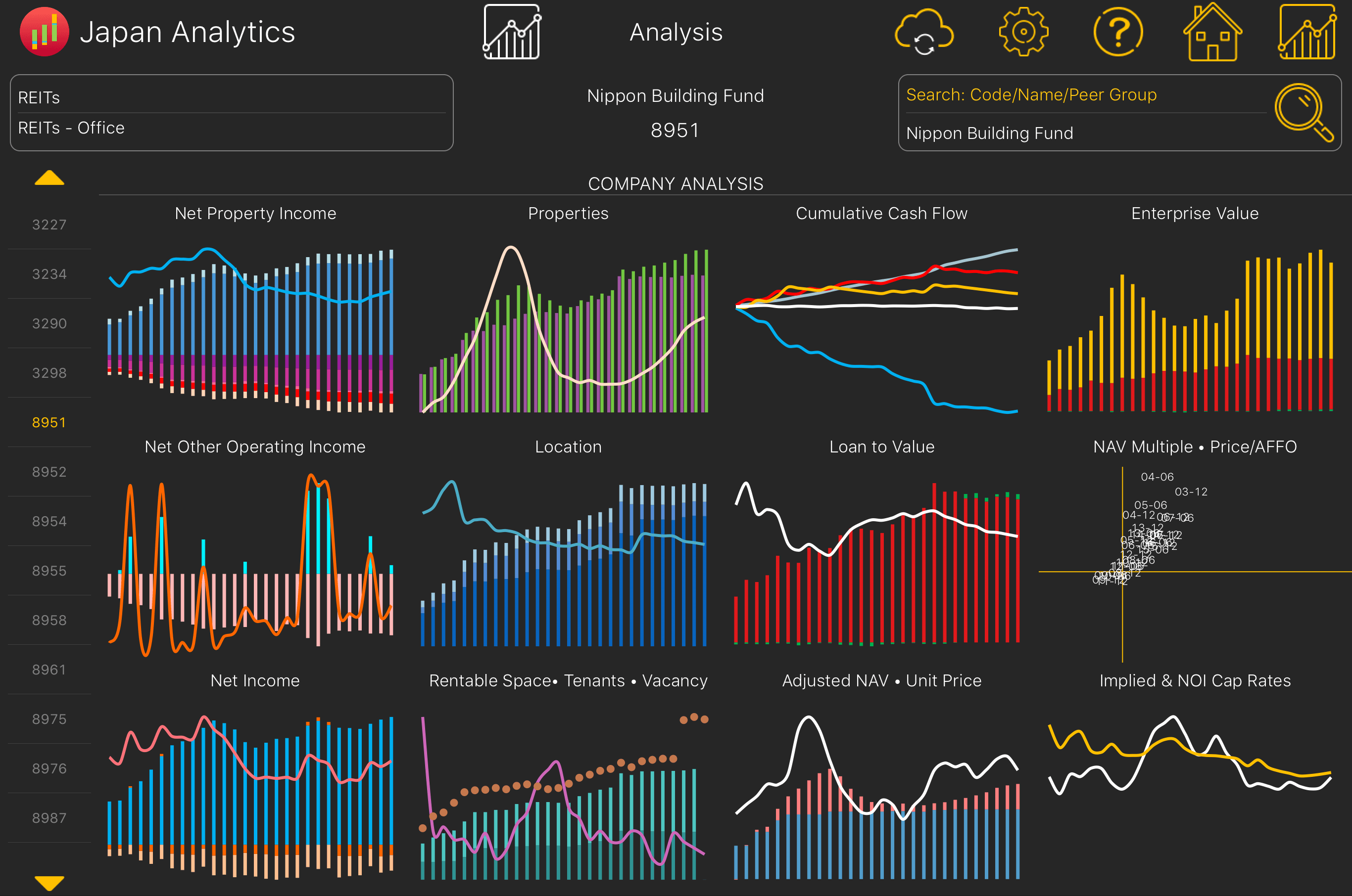 The Japan Analytics Analysis Module is the key analytical module in the App. An innovative approach to financial data visualization provides users with ready access to all key corporate financial and accounting data by means of 144 charts covering 530 data series for non-financial companies and 12 charts covering between 41 to 78 data series for financial companies. Every chart is no more than three taps away from any point in the App.