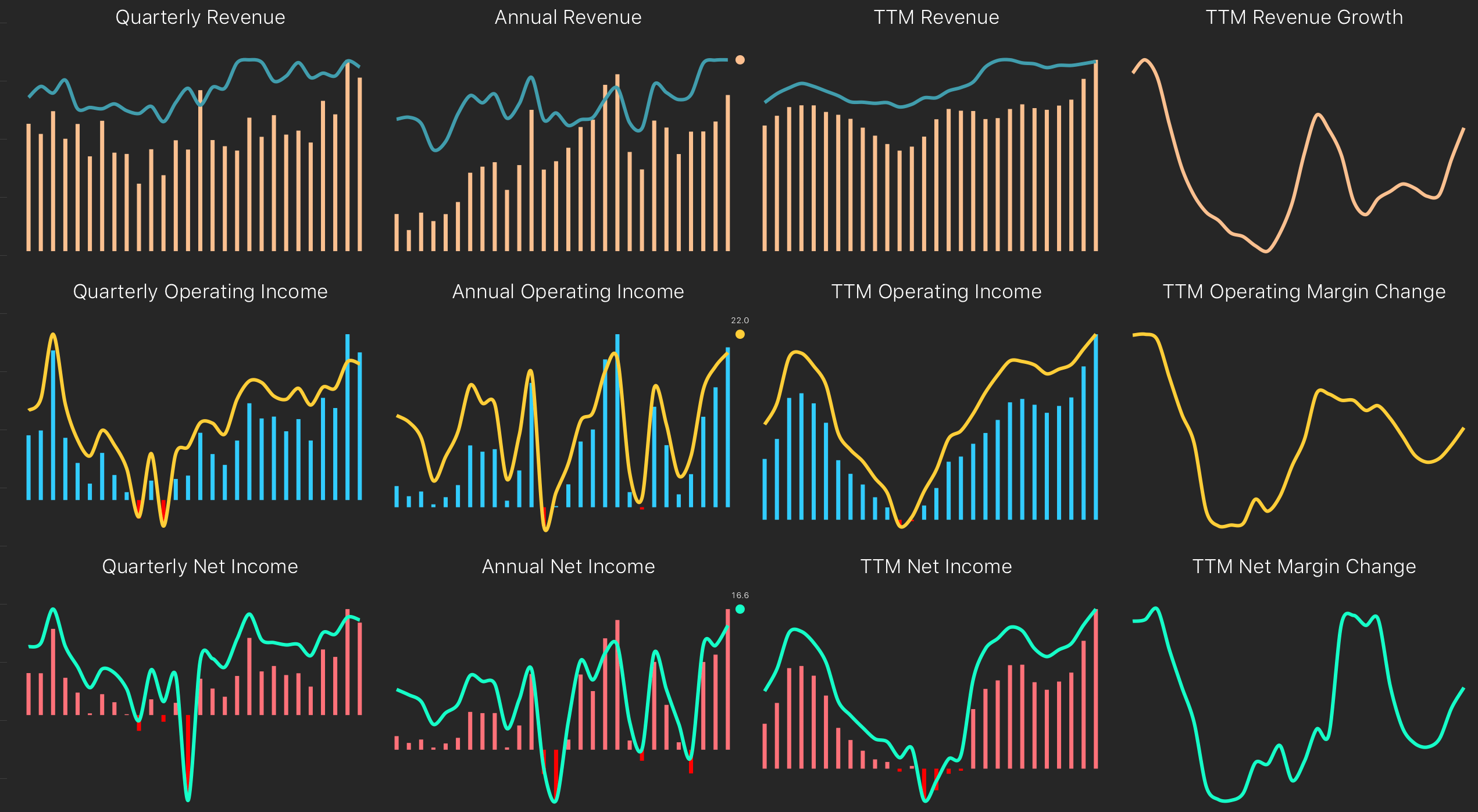 The Income Statement charts provide data on Revenue, Operating Income, Net Income, Gross Margin, Operating Margin and Net Margin for up to 28 years, 28 quarters and 28 periods of trailing twelve months (“TTM”).