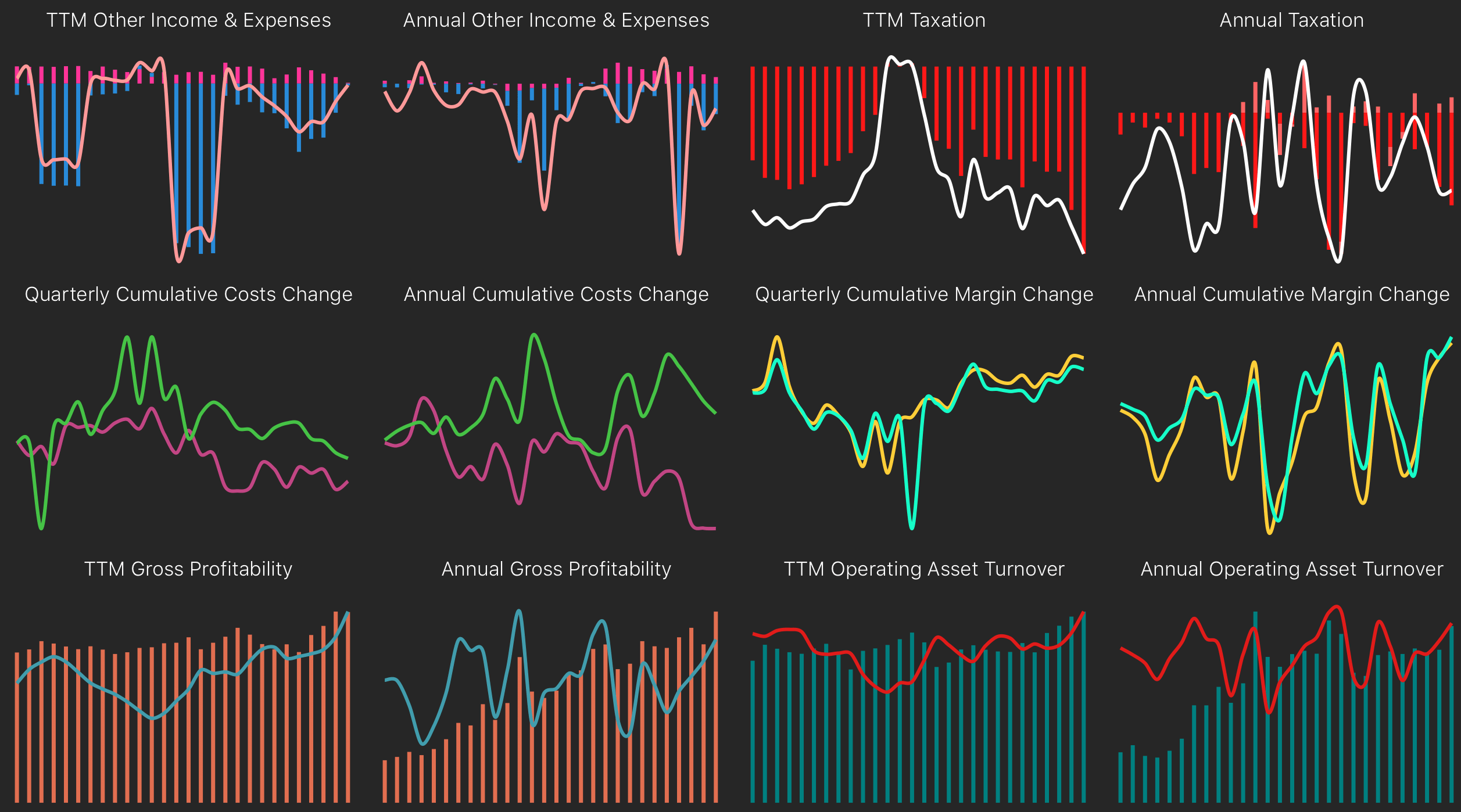 Gross Profitability and Operating Asset Turnover are shown for both Annual and trailing twelve-month periods. Annual changes are adjusted to reflect any change in the company's fiscal year-end by annualizing the fiscal year.