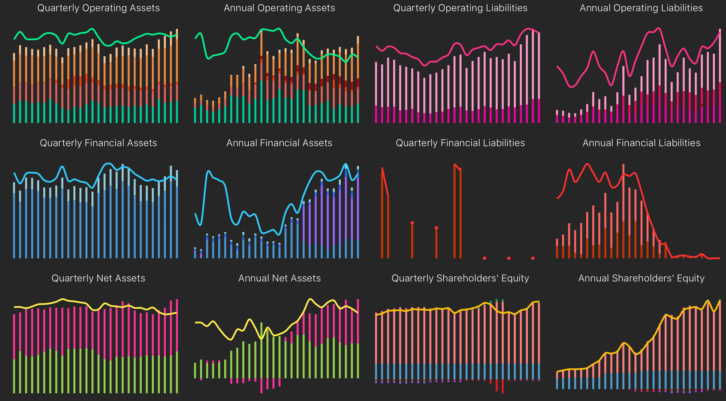 The Annual and Quarterly Balance Sheets are reformulated into four categories, Operating Assets, Operating Liabilities, Financial Assets and Financial Liabilities. Operating Assets and Operating Liabilities sum to Net Operating Assets/Liabilities (NOA/L) and Financial Assets and Financial Liabilities sum to Net Financial Assets/Liabilities (NFA/L). NOA/L and NFA/L together equal Net Assets.