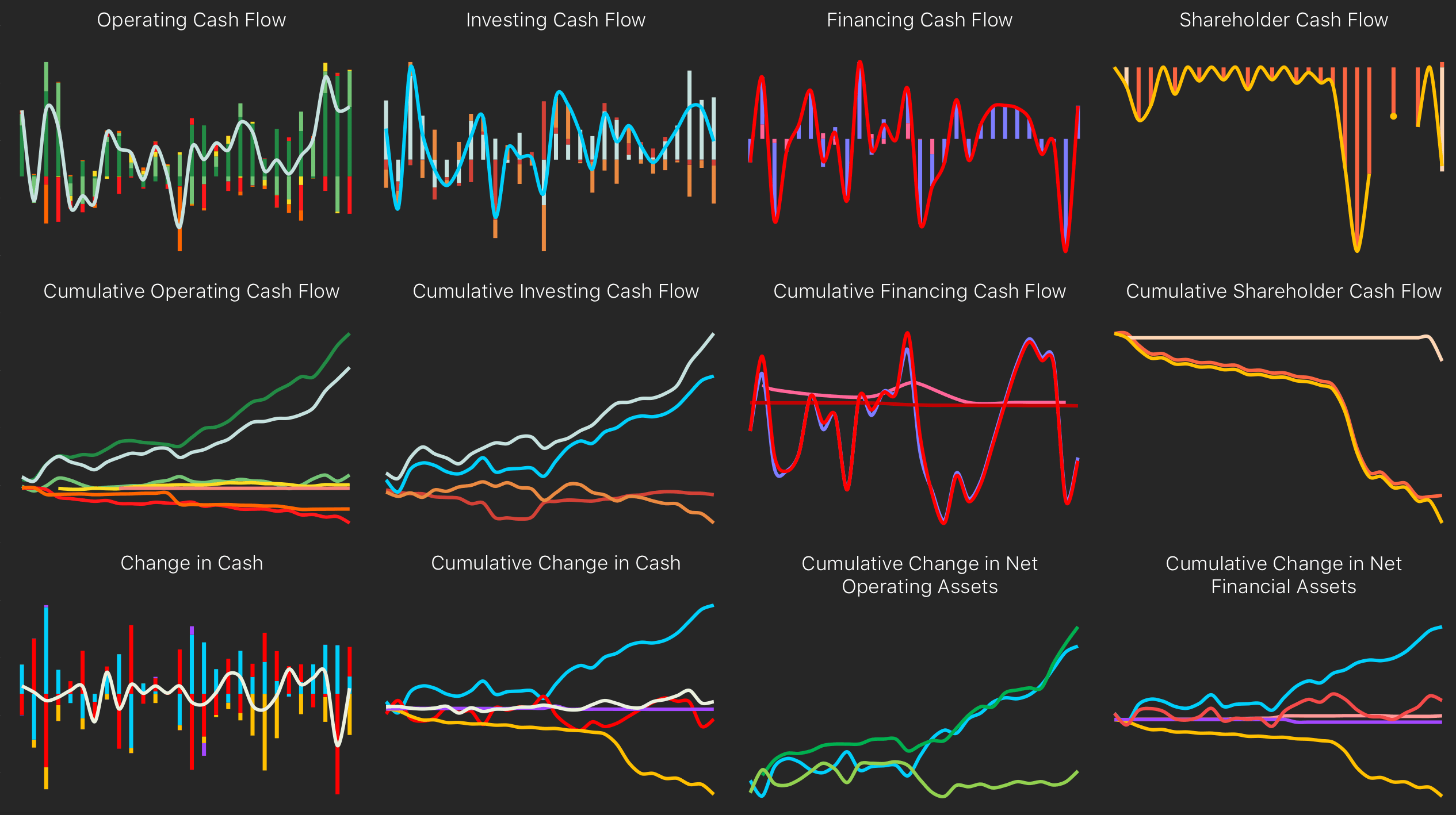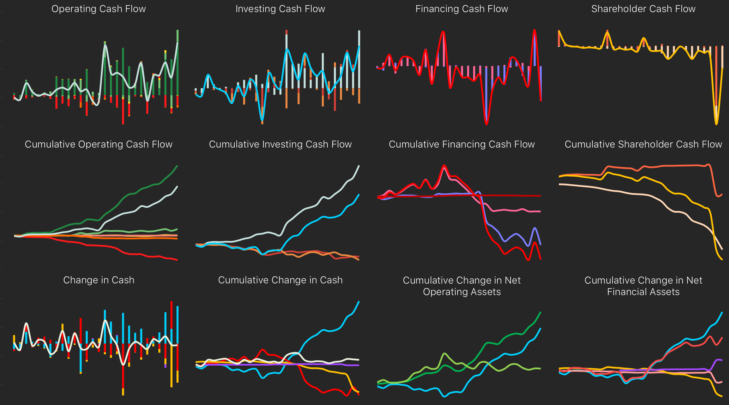Cumulative Cash Flow - Operating, Investing, Financing and Shareholder Cash Flow and Change in Cash accumulated from the Statement of Cash Flows.