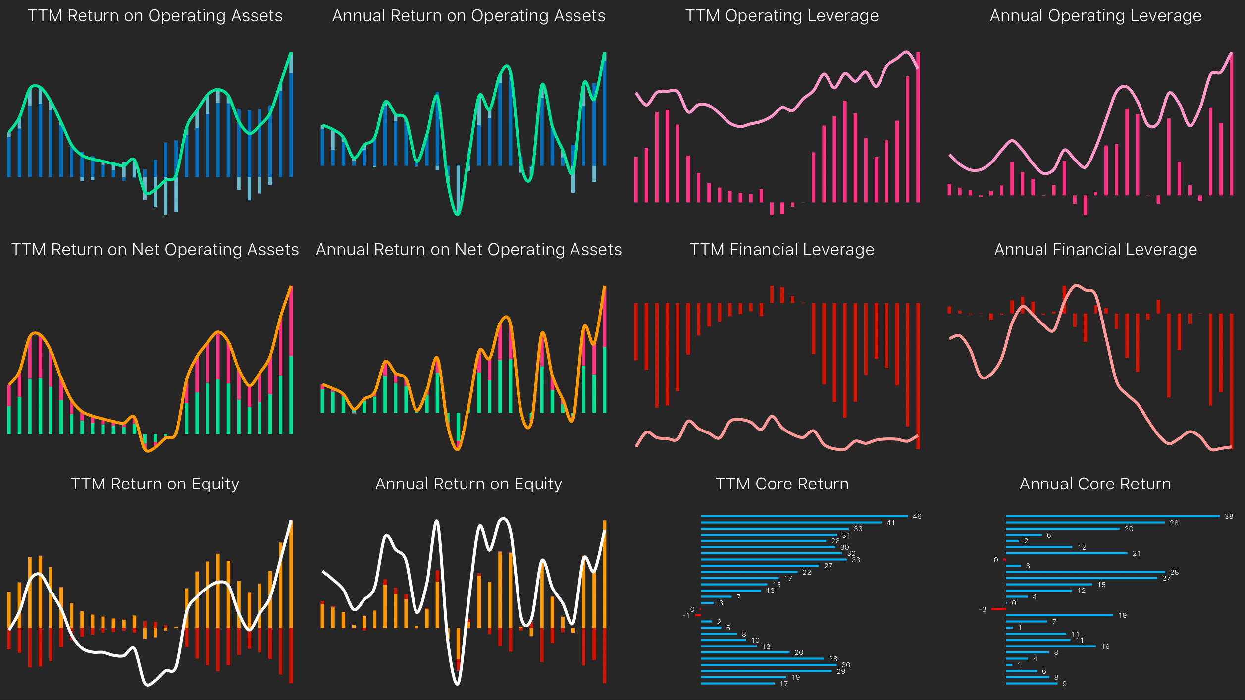 Derived Annual and Quarterly Cash Flow Statements follow a 'clean-surplus' methodology. Returns are fully decomposed into their constituent parts and the effects of both Operating and Financial Leverage re highlighted. In addition to traditional measures of value, a Residual Income approach is applied to the company's disclosed historical and prior forecasts as well as the most recent 12 months and current forecasts.