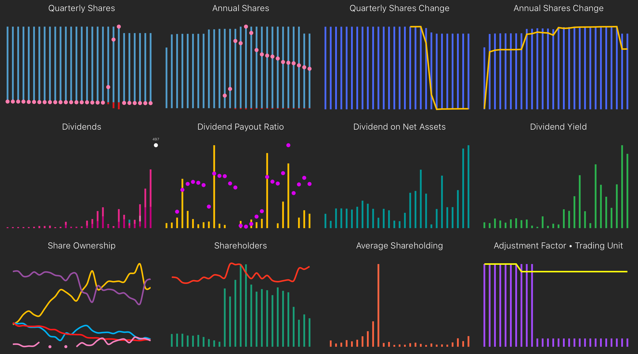 With much emphasis being placed on dividend policy and share buybacks, the App provides a full quarterly and annual history of shares issued and treasury stock with a cumulative total percentage change in the net shares outstanding. A complete dividend history is provided by period made and by type as well the ratios of dividends to and income, net assets and share price. Timelines of shareholders by class, the number of shareholders, the ratio of top 10 shareholders and the value of the average holding size are also presented.